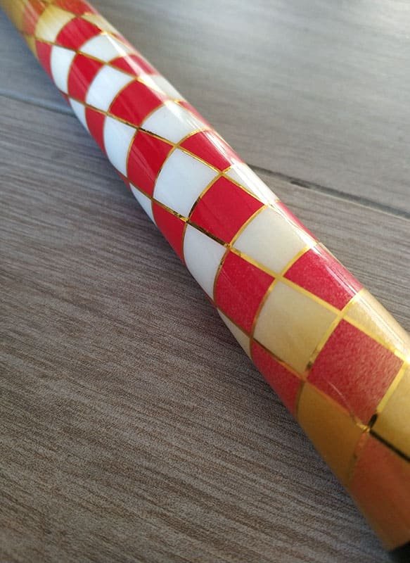 Croatian coat of arms pattern on a handmade fishing rod Blue zig zag pattern on a handmade fishing rod Pink zig zag pattern on a handmade fishing rod Orange zig zag pattern on a handmade fishing rod Purple zig zag pattern on a handmade fishing rod Golden wire for fixing and decoration Purple wire for fixing and decoration Purple custom handmade fishing rod hand